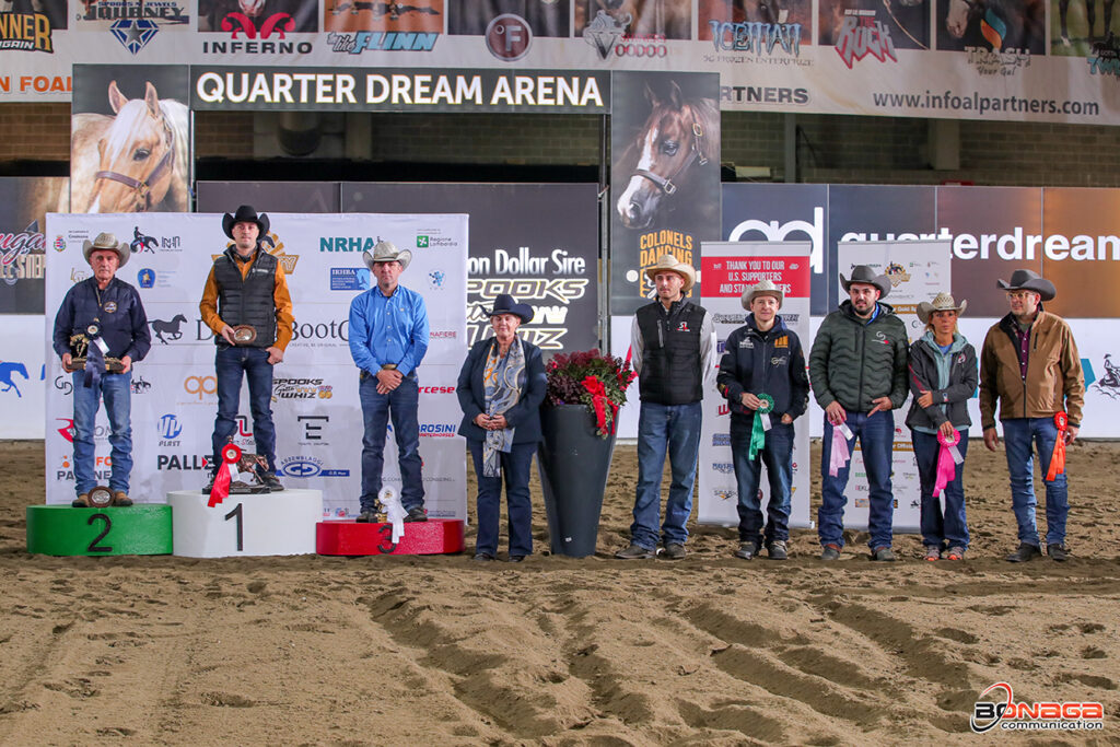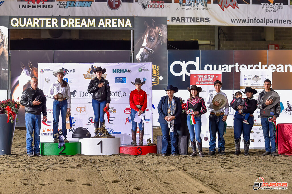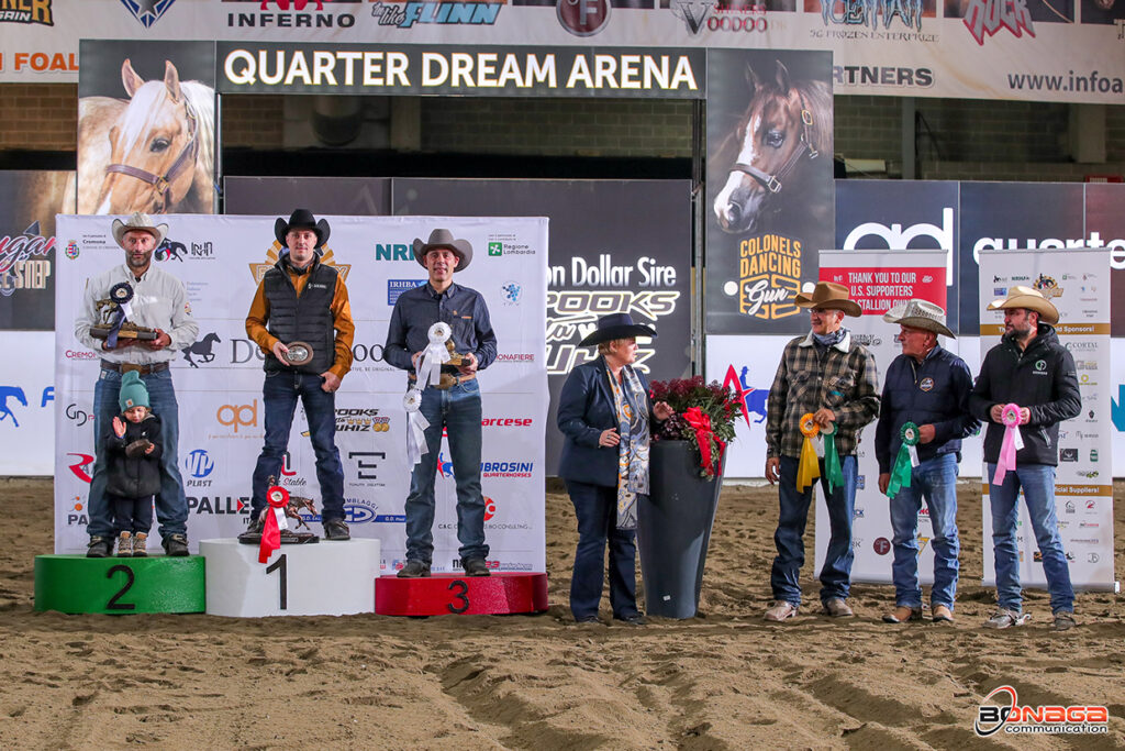 The Open Italian Championship Finals were held concurrent with the $1.000-Added NRHA Open ancillary class where Belgium’s NRHA $2 Million Rider Bernard Fonck took the win with a 217 aboard Domenico Giannitti’s GD Peptos Olena Blue (Spat A x Blue Miss Peptos Jacky). “I’m always happpy to win. My horse did four runs in 10 days: three in Lyon at the Euro Derby, and now this run here today. It’s a lot for him, but that’s the way things work when two major shows run back to back,” said Fonck. “I’m happy with how he behaved: I like him a lot, he’s a good horse and I really want to thank Mimmo [Domenico Giannitti] for giving me the opportunity to show him. This year alone we won over $30.000 and he deserves it all.”