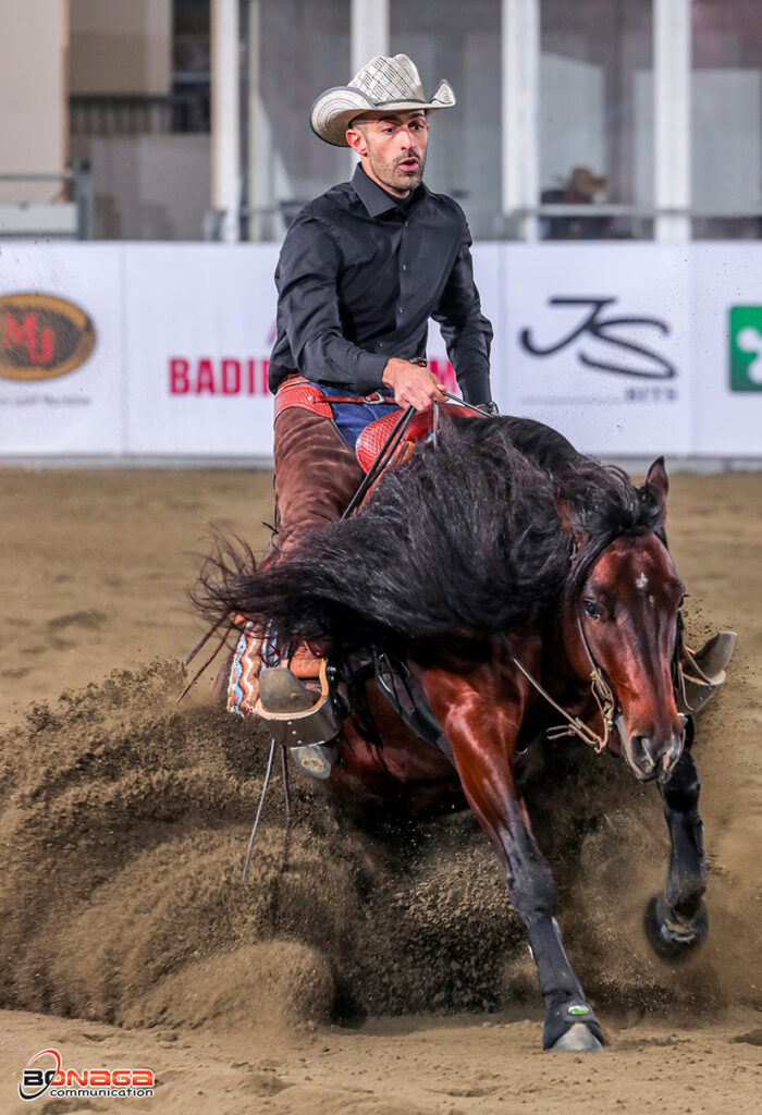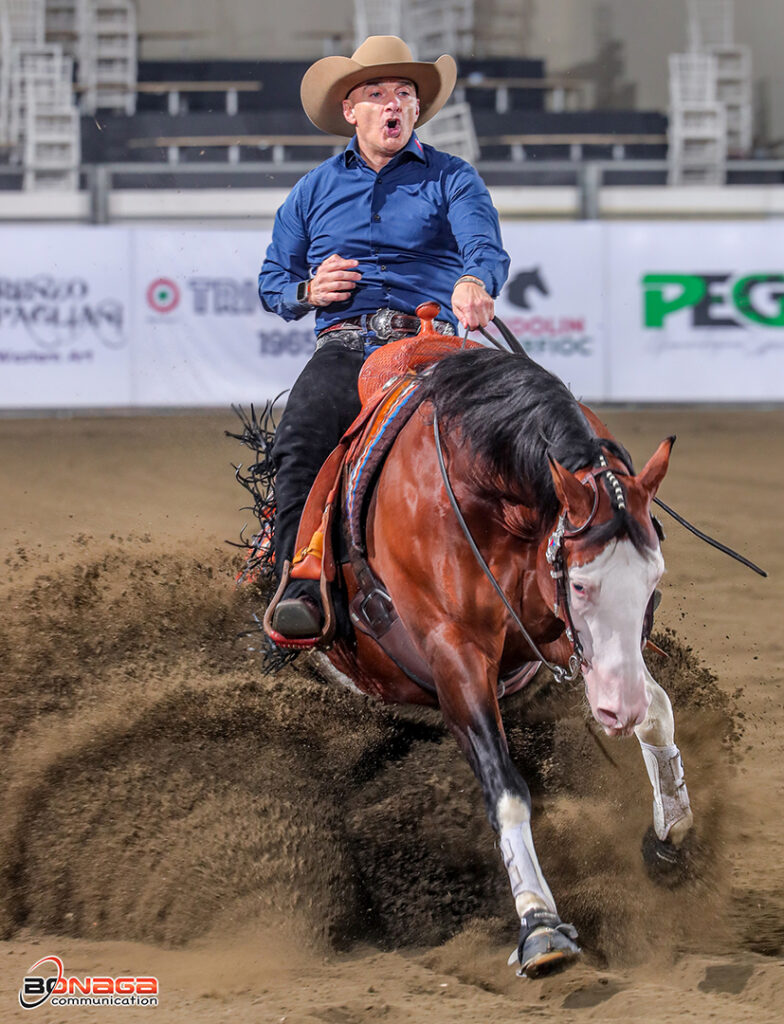 Cremona, November 13—The $700.000-Added IRHA/IRHBA/NRHA Futurity held in Cremona, Italy, crowned the $39.930-Added Tenuta Equitem IRHA/IRHBA/NRHA 4-Year-Old Non Pro Champions. Capturing the $21,200-Added Level (L)4 division was Israel’s Jehonatan Hof, riding his own A Final Smoke, a stallion by A Vintage Smoke out of Hollys Final Spark, bred by TP Ranch.