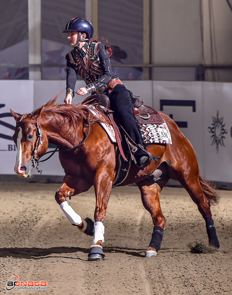 Building on her leading performance in the L3, L2, and Youth Qualifiers, young up-and-rising star Lavinia Padrini rode her Ya Know Im Cool (Sugar Little Step x Charly Step N Cool), a stallion bred by Angelika Gebert, to a 218, clinching the three Futurity Championships. “He was really incredible; it’s our second show together and he was incredible and always listened to me in the arena,” said Padrini who, since 2018, has been riding under the guidance of NRHA Professional Moreno Sacchi.