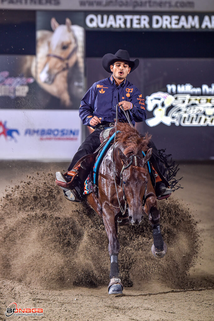 Gagan Preet Singh, a native Indian based in Italy, and Sailinginfirstplace (NRHA $13 Million Sire Topsail Whiz x Blondandboonsmal), a stallion owned by Quarter Dream and bred by Kimberly Hernandez, scored a 221.5 to win his first major event titles: the 4-year-old $3.744-Added Level 1 Open Championship and L3 and L2 Open Reserve Championships.